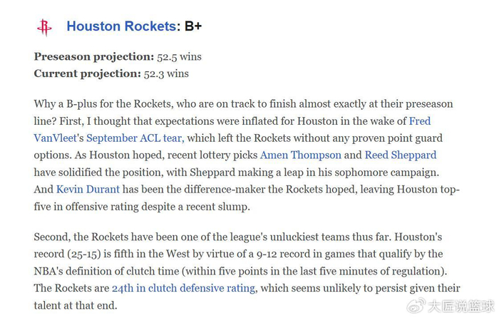 火箭队半程获B+评分!伤病带来三大明显问题 名记建议趁乱交易库里|凯文·杜兰特|斯蒂芬·库里|西部|体育赛事讨论|休斯敦火箭队_新浪新闻